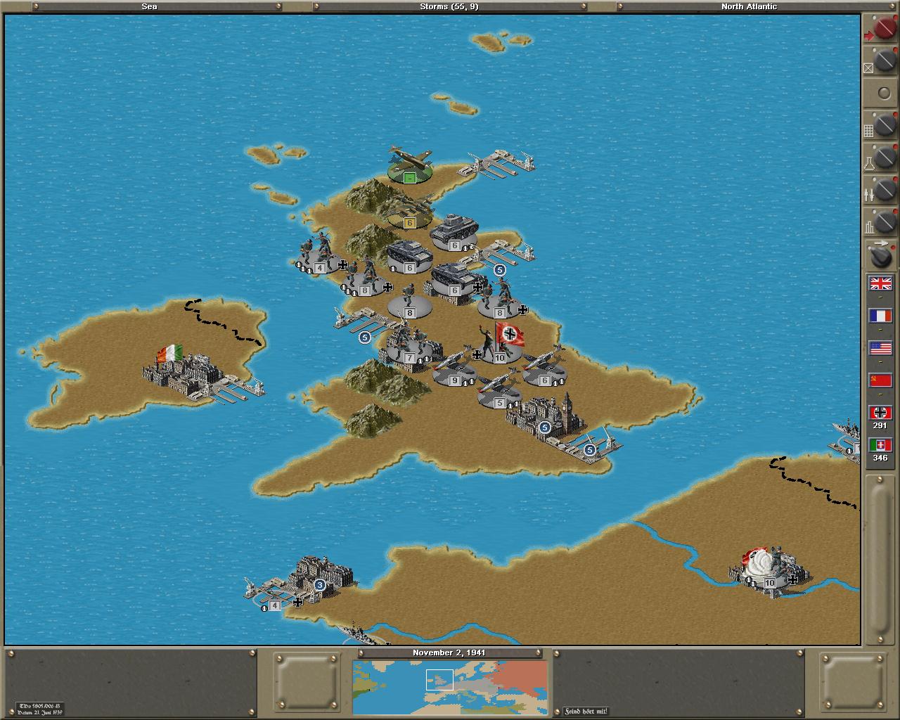 La mappa comprende il nord america, l’Atlantico con l’Islanda, Europa e la Russia fin oltre gli Urali. Gli stati a disposizione sono 30, 24 minori e 6 maggiori tra cui Germania, UK, USA, USSR, Francia, Italia, Spagna, Canada, Polonia, Finlandia e altri. Noi saremo chiamati a scegliere se prendere l’asse o gli alleati e gestiremo tutti gli stati che faranno parte dei due blocchi.