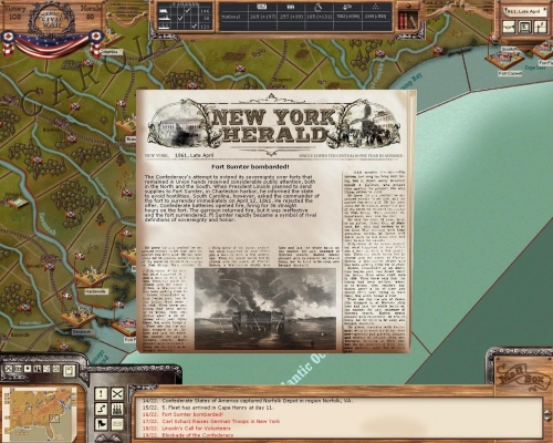 Lo scorrimento del mouse fa inoltre apparire costantemente diversi “tooltips” che chiariscono la funzione di ciascun comando sottostante. Quando nessuna unità è selezionata, una finestra in basso riassume gli eventi del turno, evidenziando in colore rosso le vicende più importanti. Il clic su ciascuno di questi eventi centra la mappa sul luogo in cui essi si sono svolti, facendo a volte apparire ulteriori informazioni. Quando quindi leggerete l’evento che racconta della vostra vittoria a Fredricksburg, potrete cliccare sulla scritta per fare apparire il report dettagliato della battaglia, già in precedenza apparsovi durante lo svolgimento del turno. Il clic sulla finestra degli eventi è particolarmente utile per tenere sotto controllo vicende che altrimenti possono facilmente sfuggire all’attenzione. Potrete ad esempio leggere che un’unità è rimasta senza rifornimenti, cliccare sull’avviso e trovarvi automaticamente selezionata l’unità, cui potrete dare a questo punto gli opportuni ordini. L’esistenza di un’interfaccia di gran classe si nota poi dai piccoli particolari. Trovo ad esempio fenomenale il meccanismo di passaggio dall’elenco degli eventi alla mappa principale. Proseguendo nel precedente esempio, dopo avere selezionato l’unità priva di rifornimenti, e dopo averle dato l’ordine di ritirarsi verso un deposito, potrete tornare nuovamente all’elenco degli eventi, e vi ritroverete proprio al punto dell’elenco che avevate lasciato, senza bisogno di far scorrere nuovamente dall’inizio le righe della finestra.