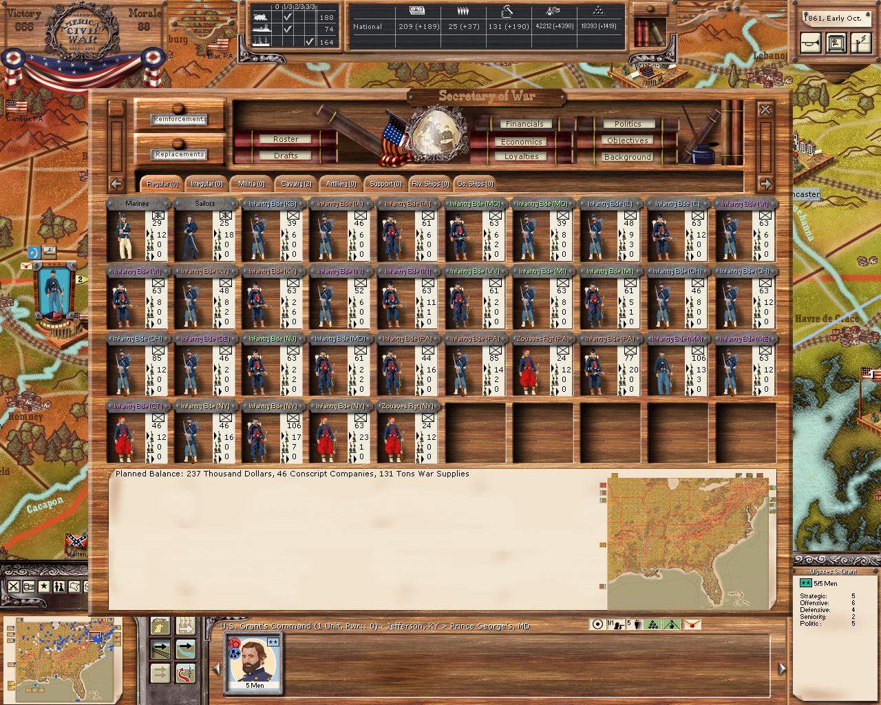 L’organizzazione dell’esercito in strutture di comando deve tenere conto della limitata disponibilità di generali di grado corrispondente, nonché dei costi rappresentativi della costruzione dei quartieri generali. Non è dunque pensabile inquadrare l’intero esercito in strutture di comando, che saranno concentrate nelle zone principali di operazioni. Al riguardo anche la gestione dei generali svolge un ruolo centrale. Ciascun generale ha proprie statistiche di attacco, difesa e “strategiche”. Molti comandanti inoltre hanno abilità speciali utili per particolari situazioni od unità (rapidità di movimento, abilità di artigliere o di cavalleria, e numerosissime altre). Il valore strategico del comandante influenza le probabilità di venire “attivato” in ciascun turno e di dare efficacemente ordini alle unità subordinate. Generali disattivati muovono più lentamente, non possono eseguire ordini speciali (come quello di marcia forzata, elusione del nemico o di assalto), e subiscono penalizzazioni in battaglia. Un elevato livello strategico dà inoltre bonus in termini di punti comando, ulteriormente incrementabili attraverso la presenza di unità di segnalamento, di aiutanti di campo (rappresentati da altri generali nella formazione), di palloni da ricognizione. Ottima poi l’idea di attribuire a ciascun generale un livello di “anzianità” e di “peso politico”. L’anzianità determina non solo l’assegnazione del comando in presenza di generali di pari grado all’interno della medesima formazione, ma soprattutto influenza le decisioni di promozione. Questa promozione è fondamentale per l’organizzazione della catena di comando, perché la formazione di armate e corpi richiede generali di corrispondente grado, inizialmente disponibili in numero limitato. La disponibilità di generali di armata e corpo d’armata è in parte predefinita, in parte decisa dal giocatore quando in battaglia un generale ha acquisito esperienza e meriti sufficienti a renderlo promuovibile. La promozione sul campo di un buon generale comporta tuttavia penalizzazioni di morale e punti vittoria quando determina lo “scavalcamento” di un generale di anzianità superiore. Così pure l’attribuzione ad un generale del comando di un’armata od un corpo può essere penalizzante in presenza di generali di grado corrispondente e di anzianità superiore. Non potrete quindi immediatamente promuovere il generale Lee al comando dell’esercito confederato, ma dovrete prima fargli acquisire il grado corrispondente, prestando contemporaneamente attenzione ai possibili effetti negativi di uno scavalcamento di generali più anziani (specie se di elevato peso politico), ancorché meno abili. La soluzione così congegnata combina elegantemente storicità (Mc Clennan a capo dell’esercito dell’Unione dovrete comunque tenervelo per un certo periodo di tempo) e libertà decisionale del giocatore. Gli effetti penalizzanti per il morale conseguenti al siluramento dei comandanti hanno perfettamente senso anche sul piano della simulazione storica: riflettono lo sconcerto derivante da decisioni che ribaltano precedenti linee di politica militare, in un momento storico in cui la superiore abilità dei nuovi comandanti non poteva essere nota.