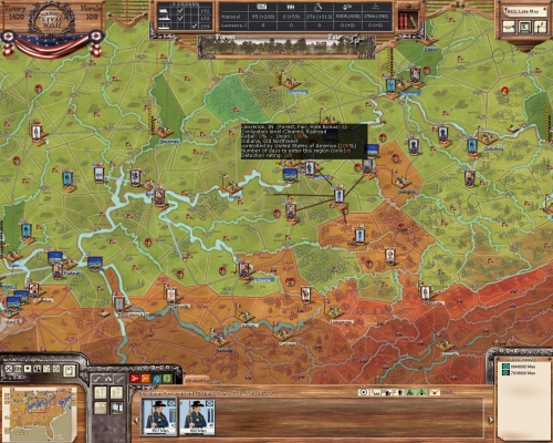 Il giocatore visualizza immediatamente la catena di rifornimento attraverso un’apposita schermata, che colora in verde le regioni rifornite, e che attraverso piccole icone in forma di cassa e palle da cannone visualizza la quantità di risorse disponibili in ciascun deposito e città. Il giocatore può inoltre rifornire manualmente alcune unità inviando loro carovane o battelli di trasporto appositamente costruiti, che si aggiungono a quelli astrattamente determinati dal sistema sulla base delle generali politiche di investimento infrastrutturale. Un’unità in zona non rifornita può dunque combattere efficacemente se assistita da carovane o battelli fluviali, ma le risorse fanno presto a consumarsi, così che la situazione può divenire problematica se l’unità non elimina le truppe avversarie e non espande l’area raggiunta dalla rete di distribuzione delle risorse. Il giocatore può inoltre espandere la rete di rifornimenti “spendendo” unità di carovane e battelli di trasporto fluviale per costruire nuovi depositi e porti fluviali. La gestione di questa rete di distribuzione deve tuttavia impedire al nemico di distruggere o saccheggiare i vostri depositi, che dovranno quindi essere adeguatamente presidiati, specialmente nelle zone avanzate dello schieramento. L’efficienza della rete è poi ulteriormente pregiudicata dalla presenza di unità nemiche sui fiumi e dalla possibilità di distruzione delle linee ferroviarie.