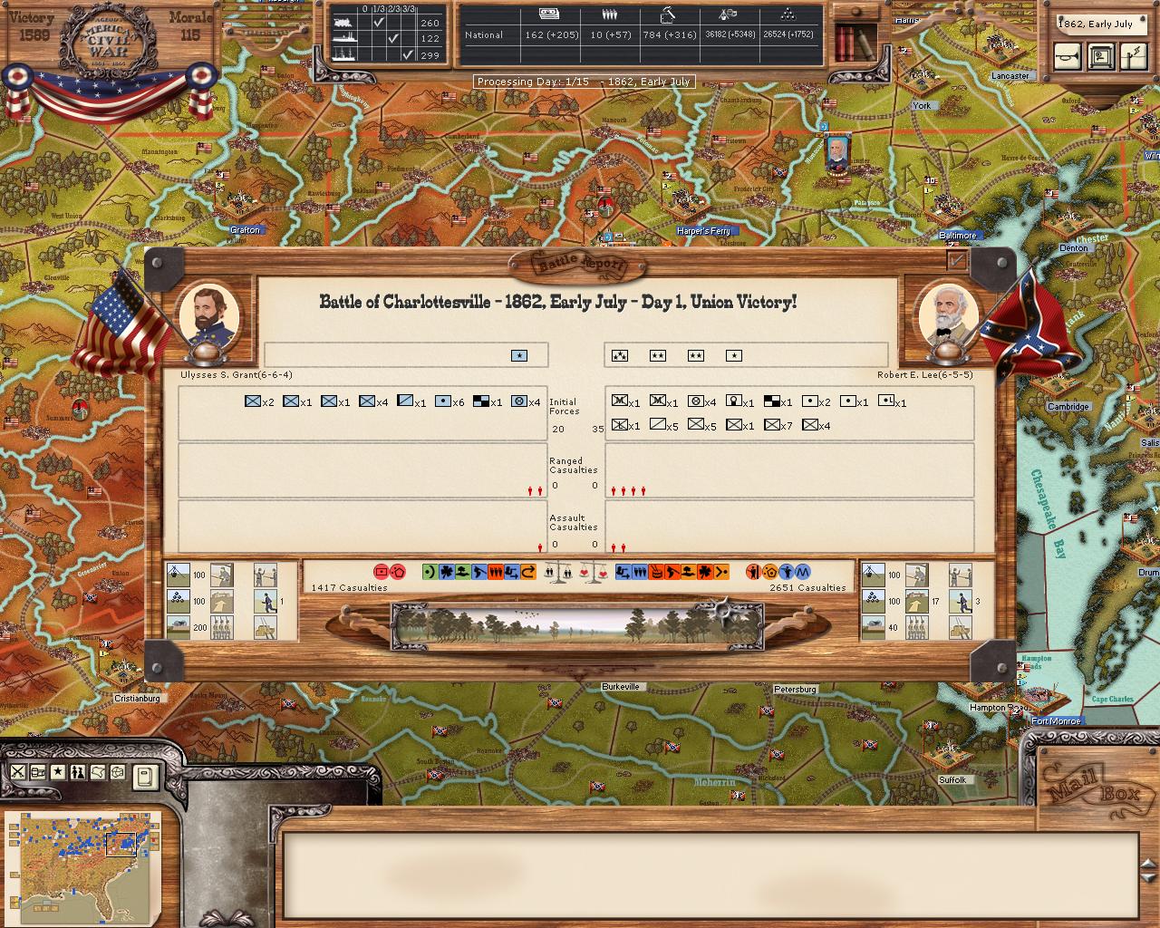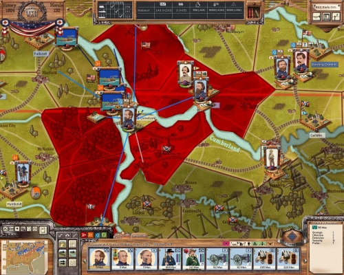 Parimenti sofisticata è la dinamica della conquista del territorio. Qui come in BoA non c’è nulla di “bianco” o “nero”, ma ci sono tante differenti sfumature. Il sistema calcola per ciascuna regione in percentuale il controllo militare e quello politico. Il controllo militare si acquisisce ed aumenta rapidamente con la vittoria in combattimento. Tuttavia le regioni controllate militarmente dalla fazione che non ne ha il controllo politico devono essere presidiate da un numero sufficiente di unità, diversamente tornando in possesso della fazione a cui la popolazione è leale. L’acquisizione di controllo politico è molto più lenta, ed è favorita dalle vicende del conflitto. Il giocatore ha a disposizione anche la possibilità di sospendere le garanzie costituzionali, o addirittura di imporre la legge marziale nelle zone occupate: così diminuendo la percentuale di popolazione ostile, ma subendo penalizzazioni in termini di punteggio. Nelle città ostili all’occupante possono anzi nascere unità partigiane in grado di cacciare unità militari nemiche non sufficientemente forti. La lealtà della popolazione delle regioni consente inoltre di superare la nebbia di guerra e di individuare unità nemiche anche distanti. In assenza di un sufficiente livello di controllo militare le unità sono penalizzate nell’attaccare da zone attraversate da fiumi, e devono necessariamente assumere un assetto di attacco, così logorandosi. Il logoramento derivante da combattimenti e movimenti in territorio ostile rende perciò necessario pianificare attentamente gli attacchi, programmare la conquista di città nemiche in tempi relativamente rapidi, per poi fare riposare gli attaccanti. I problemi di logoramento possono divenire drammatici nei mesi invernali, durante i quali il gelo potrebbe infliggere alle truppe perdite ancora più consistenti di quelle derivanti dal combattimento. La costruzione di forti può offrire in tali casi un valido riparo anche nelle regioni prive di città, ma è lunga e costosa. Ulteriore ostacolo al movimento è dato dalla presenza di forti nemici e da insufficienti livelli di controllo delle regioni circostanti, che possono inchiodare le vostre truppe impedendo loro di muovere in zone adiacenti, evidenziate in tali casi in rosso. Il complesso dei fattori di logoramento, restrizioni dei movimenti e necessità di rifornimento determina un gameplay dove le avanzate sono lente e precarie: è facile esultare per la conquista di una città strategica destinata ad essere perduta per mancanza di rifornimenti, o per affaticamenti che ci costringeranno ad arretrare anche di fronte ad eserciti inferiori. Le regioni di AACW hanno tuttavia dimensioni estremamente ridotte, e consentono un gameplay interessante e dinamico anche quando gli spostamenti di fronte sono complessivamente limitati.