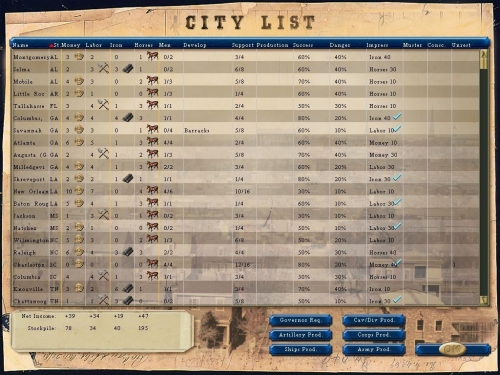 Ancor più discutibile è tuttavia la gestione delle schermate. FoF consente di aprire schermate relative alla produzione, alla diplomazia, alle città, alle unità, alla disposizione strategica di armate, corpi e divisioni, alla localizzazione degli stati e dei governatori. Le interrelazioni fra le schermate, e fra queste e la mappa principale, sono tuttavia insoddisfacenti. FoF per la verità migliora uno degli aspetti più discutibili di CoG: consente di selezionare le unità nella schermata riassuntiva delle forze, e di ritrovare automaticamente l’unita selezionata nella mappa principale. In tal modo è possibile localizzare nella schermata riassuntiva unità che nella mappa principale possono facilmente essere perse di vista. Se quindi vi siete persi l’armata del Potomac, potete cercarvela nella schermata riassuntiva, qui selezionarla, e trovarvela così nella mappa principale. Altrettanto tuttavia non potete fare con le città (la patch di imminente uscita dovrebbe superare questo inconveniente), con le icone rappresentative di armate corpi e divisioni nella mappa della disposizione strategica, e soprattutto con i governatori degli stati. Così ad esempio potrà capitarvi di aprire la schermata dei governatori, e qui vedere che il governatore di NH chiede la presenza di 16 brigate sul suo territorio. Ora, già capire che NH sta per New Hampshire può non essere semplicissimo per noi italiani. Capito questo, delle due l’una: o sapete a memoria dov’è il New Hampshire, altrimenti passerete qualche minuto a cercarvelo sulla mappa principale. La possibilità di selezionare direttamente il New Hampshire dalla schermata dei governatori non esiste. Gli sviluppatori mi hanno spiegato che gli stati non sono in realtà selezionabili, solo le singole province lo sono. Forse però sarebbe stato possibile consentire di selezionare direttamente dalla mappa dei governatori la provincia della capitale dello stato, semplificando la vita alle persone di cultura medio-bassa come me, che non ricordano a memoria la localizzazione del New Hampshire (o del medio Mississippi).