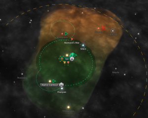 Note iniziali: secondo i miei calcoli, i primi 3 capitoli rappresentano solo circa 30 minuti di gioco effettivo. Sicuramente se non stessi scrivendo un AAR avrei impiegato anche meno tempo, senza dover cercare la migliore posizione delle finestre prima di fare uno screenshot. Inoltre da questo capitolo sono passato dalla patch 1.3 alla 1.3.1 di Stellaris. Capitolo 4: Un'anomalia dopo l'altraPrima di tutto una panoramica della galassia intorno a Sol: Gli ultimi alieni incontrati si trovano nel sistema di Dossel. Il cerchio tratteggiato esterno è il limite raggiungibile dalle mie stazioni wormhole. Mentre si procede lentamente con la costruzione della nave colonizzatrice, i dati rilevati dai sensori sulle due specie aliene incontrate vengono analizzati. Ci sono buone notizie e cattive notizie. I Tiyanki non sembrano una minaccia, ma i pirati lo sono sicuramente! Speriamo non attacchino se non provocati. Al momento la loro potenza militari è molto superiore a quella delle mia flotta di 10 corvette (circa 800 vs 300), ma spero di ricercare presto migliori tecnologie per difendermi ed eventualmente attaccare. Nel frattempo le due navi scientifiche guidate da Bauer e Nakamura continuano a esplorare nuovi mondi, trovano spesso interessanti anomalie. E finalmente la prima nave colonizzatrice delle Repubblica di Sol, la ISS Thach, è pronta a colonizzare nuovi mondi! Alfa Centauri, stiamo arrivando! O forse no?